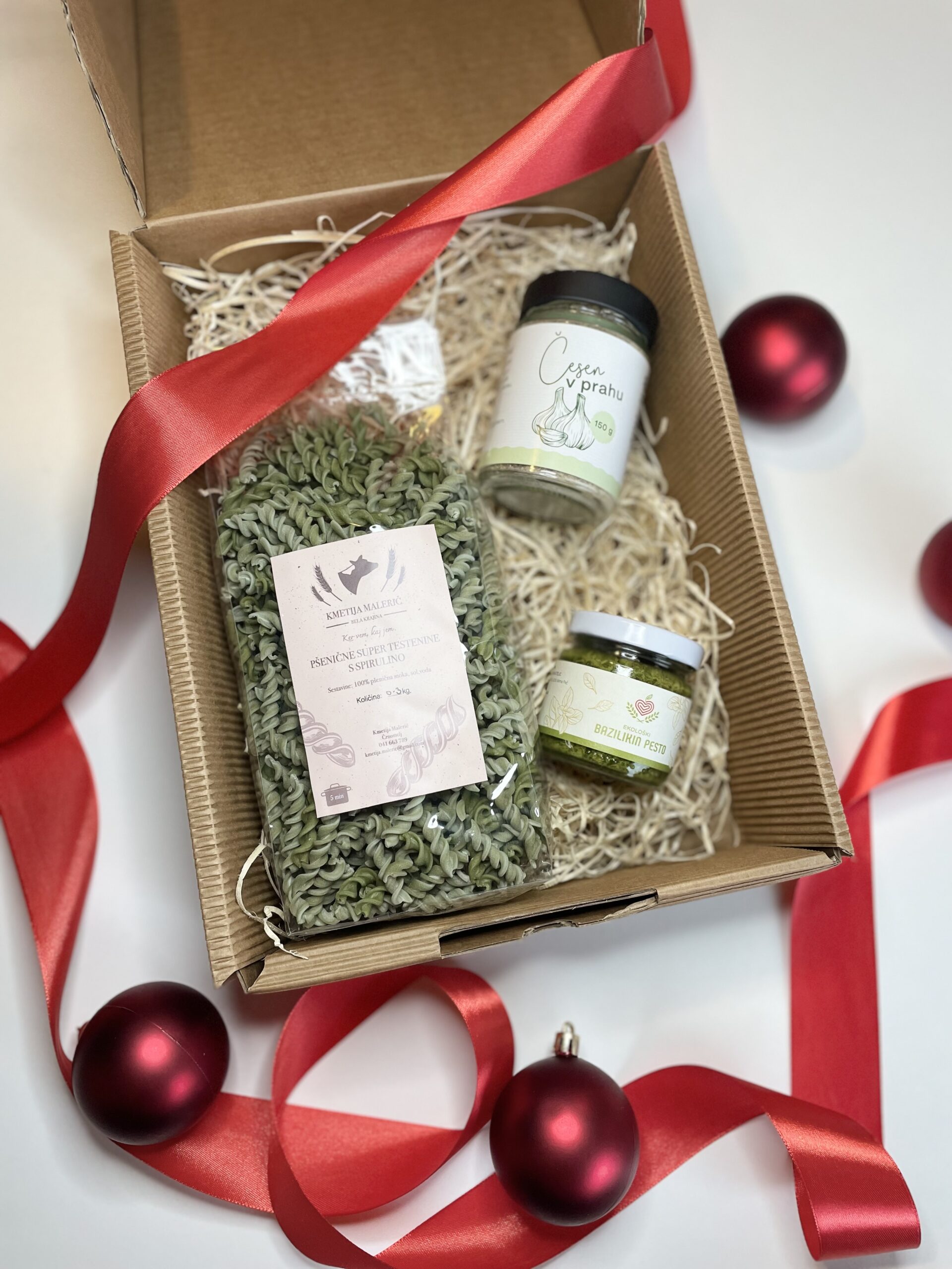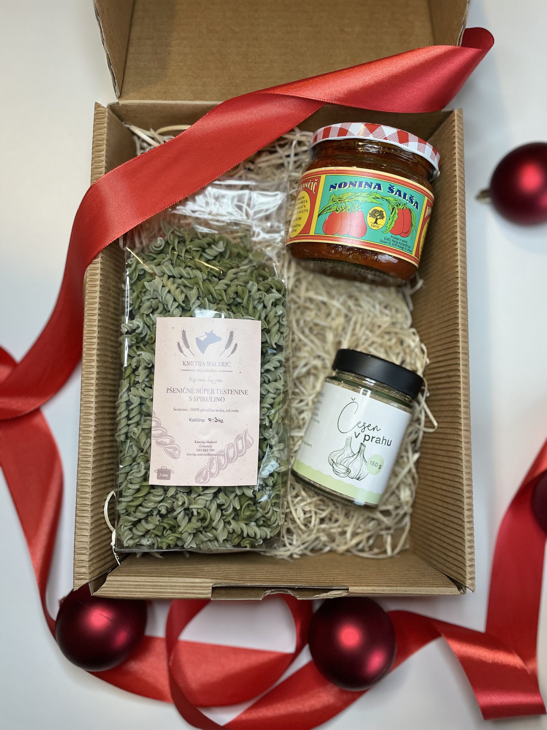 Okus domače tradicije v sodobni izvedbi. Darilni paket Nonina kuhinja prinaša pšenične testenine s spirulino, nonino šalšo iz domačih paradižnikov ALI bazilikin pesto ter kakovosten česen v prahu. Popolno darilo za vse, ki radi ustvarjajo preproste, a vrhunske obroke.