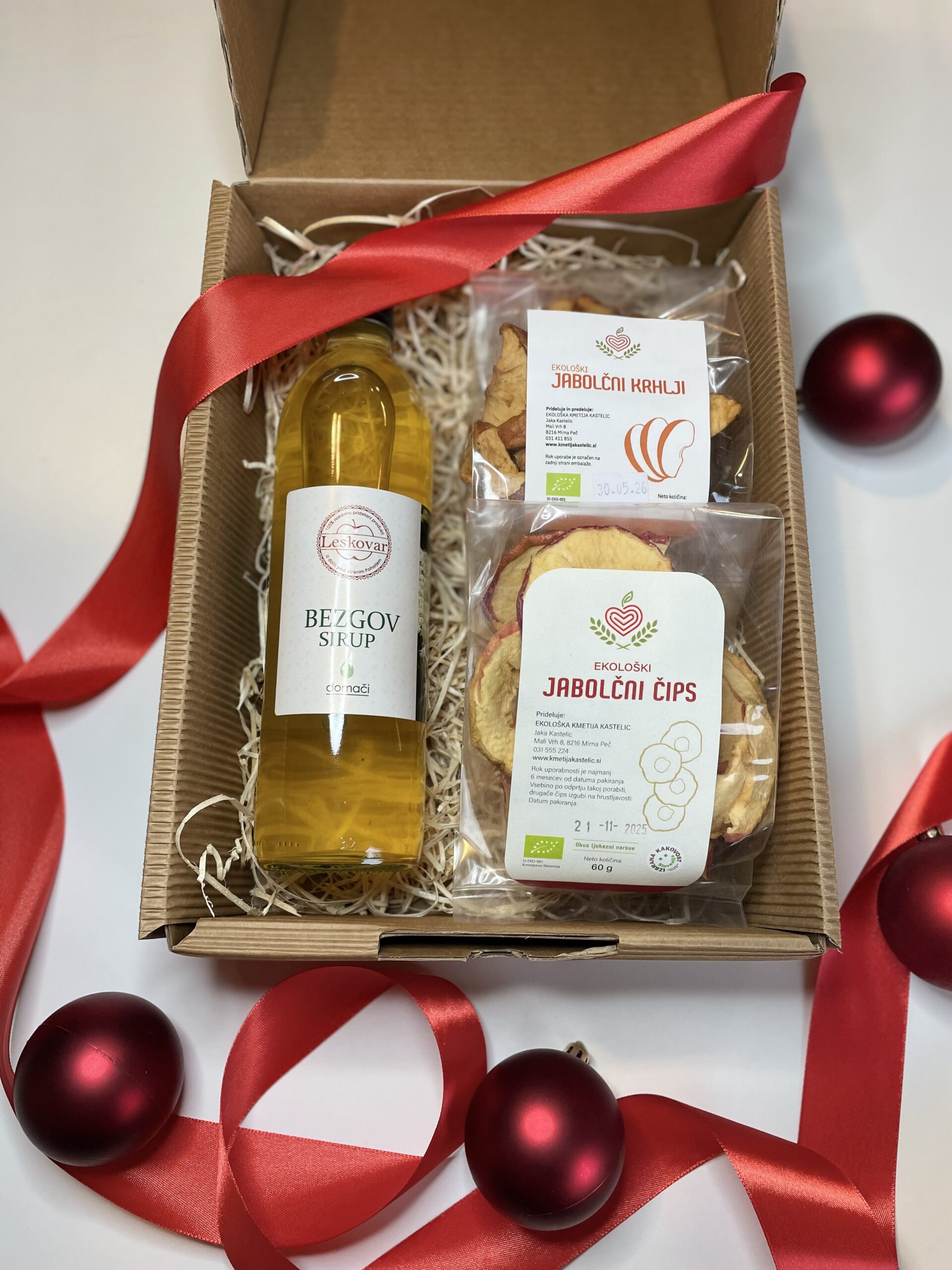 Lahkoten, domač in dišeč paket za vse ljubitelje naravnih prigrizkov. Darilni paket Sladki objem prinaša domači bezgov sirup (ali drug sirup po izbiri), ki v prostoru pričara vonj po poletju, ter dva ekološka jabolčna prigrizka: jabolčne krhlje in hrustljav čips. Popolno darilo za vse, ki prisegajo na čisto naravo in zdrave poslastice.