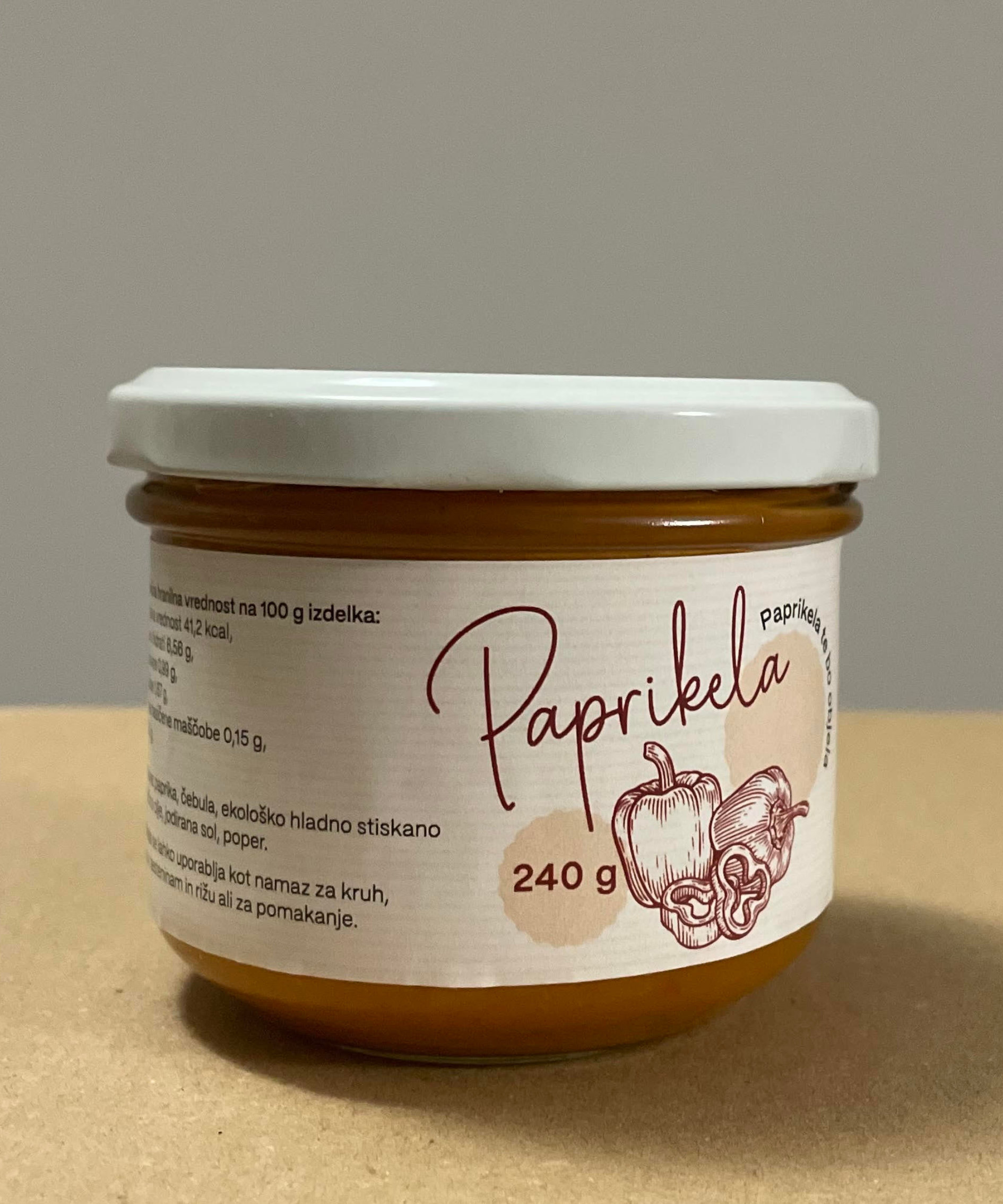 Paprikela je nežna, domača paprikina krema, pripravljena iz skrbno izbranih sestavin: paprik s kmetije Jarkovič (Šentjernej), čebule s kmetije Porenta (Žabnica), ekološkega hladno stiskanega sončničnega olja z ekološke kmetije Kastelic (Mirna Peč), soli in popra. Brez dodatkov, brez ojačevalcev okusa – samo čista, poletna dobrota v kozarčku.