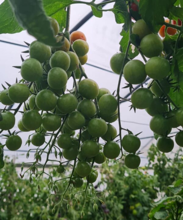 Rastline so polne paradižnika, a zaradi hladnega vremena žal ne dozoreva več. Ker vemo, da marsikdo uporablja tudi nezrel paradižnik, smo v ponudbo dodali mix pakiranje: češnjev in solatni paradižnik, pelati.